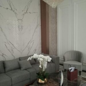 The centerpiece of this space is the magnificent full-height bookmatched Statuario marble wall paneling, harmoniously paired with warm copper-toned fluted timber panels and textured grey Travertine marble accents. The graphite grey 4-seater modular sofa, upholstered in premium textured linen-blend fabric, provides ultimate comfort while keeping the room’s silhouette modern and clean.